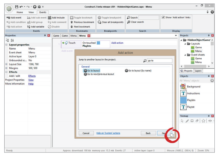 và Event sheet 1 của layout Game.
